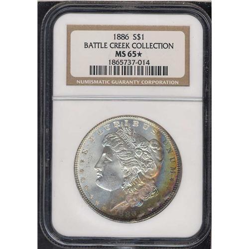 Attractively toned as are the others in this outstanding group of Battle Creek coins. A solidly graded, premium quality Gem, this coin displays impressive striking definition for a silver sollar from the Philadelphia mint. This is also to say that the strike is full, including those few hair strands over Liberty's ear which often keep this from gem quality.