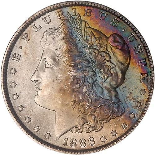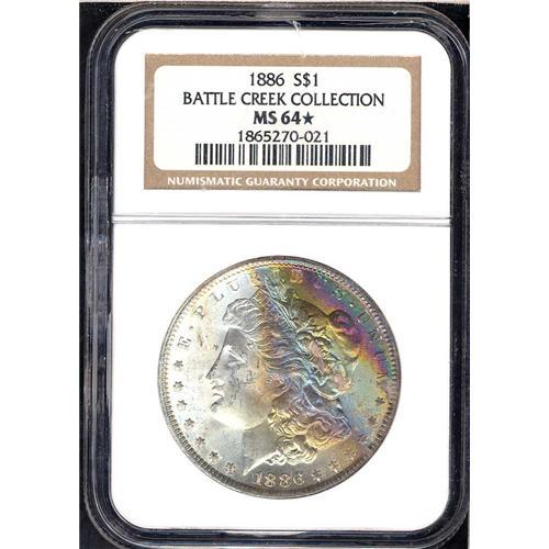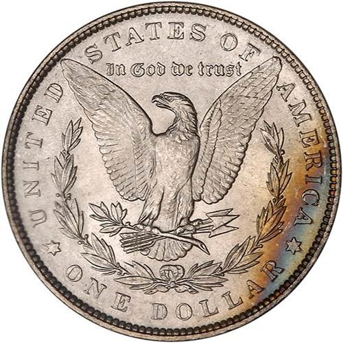 A wide range of colorful (and iridescent) hues graces the obverse of this well struck Morgan dollar from the Battle Creek hoard. As the picture shows, and as your eye will drink in, the toning on this piece almost inspires awe in any collector versed in the collecting of toned Morgan silver dollars. Definitely deserves the Star mention by NGC.