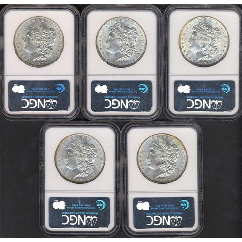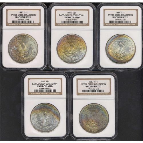 Includes two reverse toned 1886 NGC Uncirculated and three reverse toned 1887 NGC Uncirculated. Lot of 5 coins.