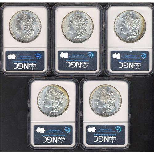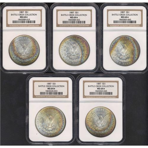 Includes five reverse toned 1887 NGC MS64*. Lot of 5 coins.