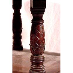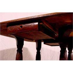 Victorian Walnut Parlor Table. Primarily walnut the rim of the top has walnut veneer. The base has pineapple motif turnings and is strongly carved. The top of this piece is missing its original fabric, but everything else is sturdy and intact. American, Ca. 1860. Est. $300 - $500.
