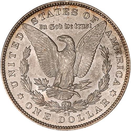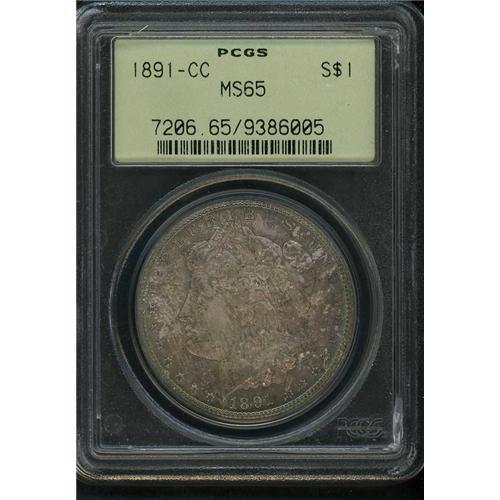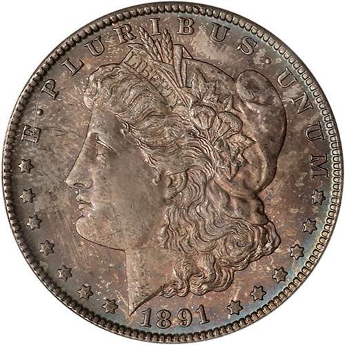 A satiny frosted gem with energetic cartwheel luster underneath rich brownish gray to steel with blue toning that seems to want to motivate bidders to increase their bids as though by subtle hypnotism! For some reason, in spite of thousands of 1891-CC dollars being offered in the 1970s through the GSA sales, gems are much scarcer than the earlier dates such as 1882-CC to 1885-CC. Collectors will want to make a note of this desirable fact.