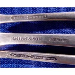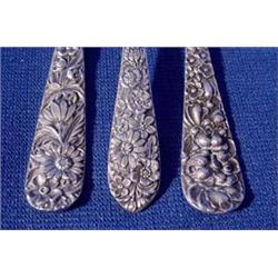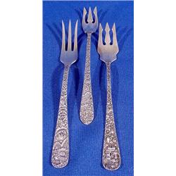 Three (3) Serving Forks; All in Repousse type patterns, all sterling including "S. Kirk & Son", "Alvin" and "Stieff", 5 - 6" l. Est. $100 - $200.