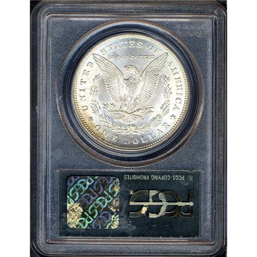 Intense cartwheel luster graces the satiny, matte-like surfaces of this attractively preserved gem. A consistent silvery white frost graces both sides. The strike is nowhere soft on the reverse nor on the obverse, and we report but a single noticeable bagmark on Liberty's cheek below the eye.