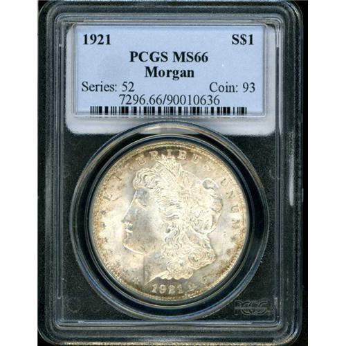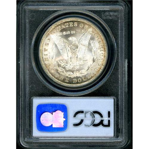 A white, mostly untoned example, as crisp and lustrous as when it was first issued save for the intrusion of some color along the rims on both sides. Struck with systematic exactness throughout, there is no need to ignore the central part of the design where a somewhat rounded impression is occasionally left by the dies. This this coin is decidedly bold in the centers. Last year of the Morgan design.