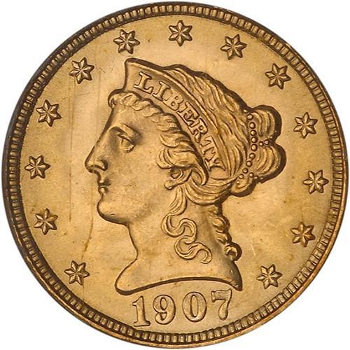 Tremendous detail from a very positive strike, which collectors like better to see than wishy-washy detail; furthermore, the gemmy surfaces show vivid golden hues. All this is perhaps obvious from the photos. What we need to emphasize too is that the strike is customarily crisp and detailed for the 1907 date, with the usual sharp metal flows into the deepest recesses of the dies on both sides. Last year of the Liberty head series.