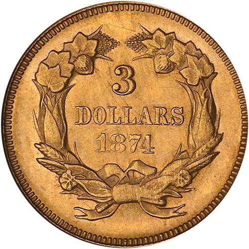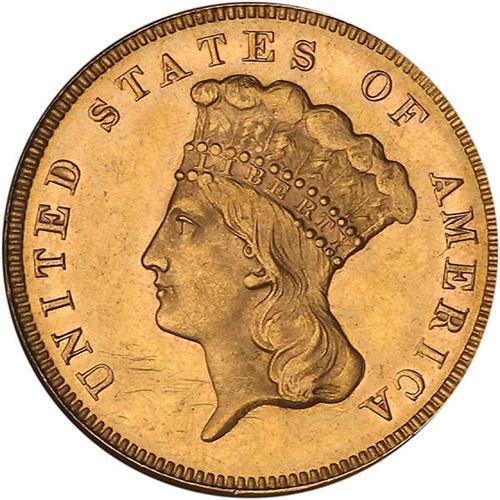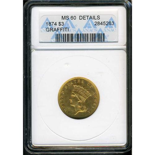 Some graffiti in the fields mars this otherwise lustrous Mint State three dollar gold piece.