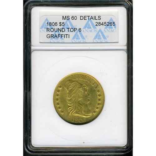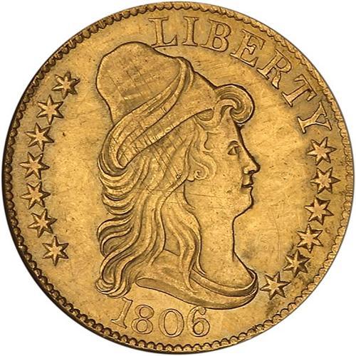 Some graffiti on the surface of this otherwise lustrous, well struck early half eagle. The year 1806 contains two distinct date varieties, this piece having a knob on the end of the 6 while the complementary variety has the end of the 6 coming to a point. Either variety is plainly desirable to represent the capped bust right, heraldic eagle reverse Type in a U.S. gold type set.
