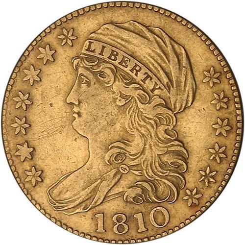 The large date, large 5 variety is one of four major subvarieties in the 1810 half eagle stable. This well struck piece has a nice impression of Liberty and the eagle, with clear stars and even some slight signs of luster evident in the protected areas. The capped bust to left design began in 1807 and lasted only until 1812 before major modifications occur to the bust of Liberty, ending the Type rather abruptly.