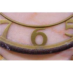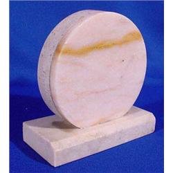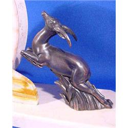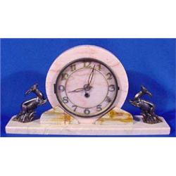 Polished Marble German mantle clock set. Accented with metal bronze patinated antelopes and two decorative side pieces. This stone clock does have a repaired crack along a vein in the base. The wind up clock has a brass face and hinged metal cover. Minor chips. Ca. 1900. 17'l x 3.5"w. Est. $200 - $300.