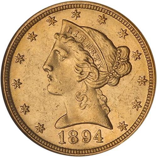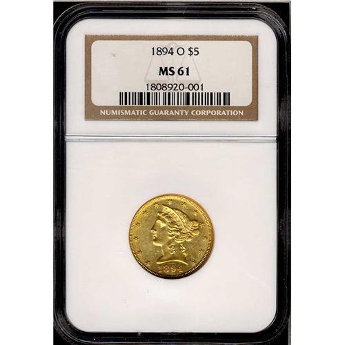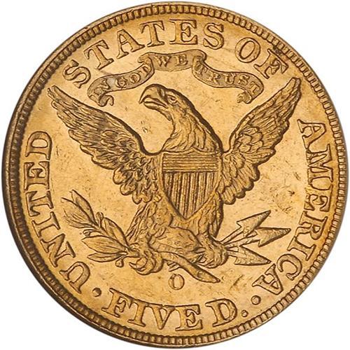 A lustrous example whose golden brilliance whirls dizzily around the surface with only light intervening bagmarks. A sharp impression was left by the recoil of the dies that struck this O-mint half eagle. Production was very low that year, consisting of 16,600 pieces.