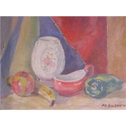 "F.A. Barney" Signed Still Life Oil Painting on Artist's Board; Ca. 1925. Still life with fruit and china, signed lower right, mounted in simple wood frame painted white. Painting in nice condition with surface dirt, frame distressed. s.s. 15.5"w x 11.5"t. Est. $200 - $300.