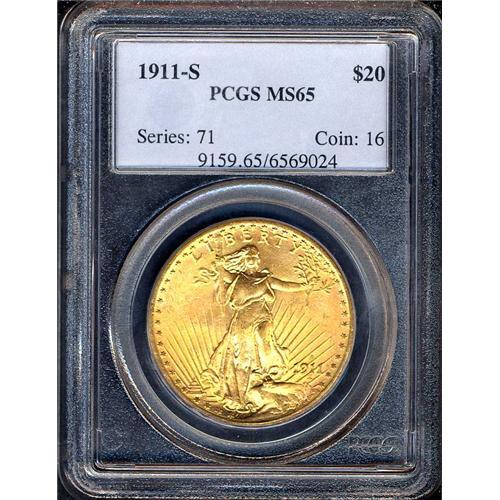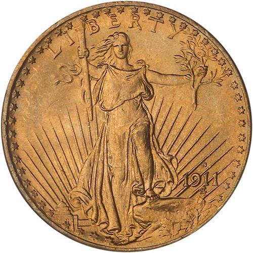 A beautiful golden-bright coin with no objectionable marks or blemishes. Something perhaps worth pausing to study is the fact that all devices were struck with the usual and desirable consistency of this year, that is, sharply by the dies, which then left behind bold elements of detail throughout. A resplendent 1911-S double eagle by any measure.
