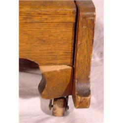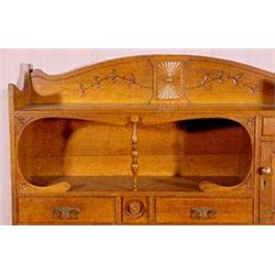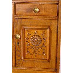 Victorian Chip Carved Oak Bookcase; This impressive oak bookcase has its original surface. There are four drawers, a raised panel door with a carved flower. The open gallery top is accented with beautifully shaped molding and a turned post. A great old American piece with lots of detail. Ca. 1890. 65"h x 49"w x 12.5"d. Est. $300 - $400.