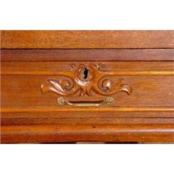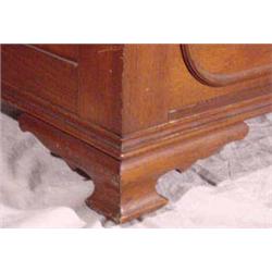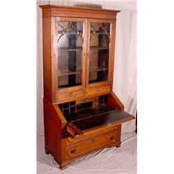 Victorian Walnut Secretary Bookcase; This bookcase has three adjustable shelves with two drawers underneath. The drop front desk opens to reveal a pigeon hole interior and an oil cloth writing surface. The base also has three drawers and a bracket base. A finely crafted piece with a nice old finish. American. Ca. 1860. 86"h x 44.5"w x 22"d. Est. $600 - $800.