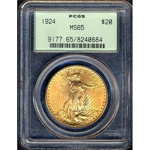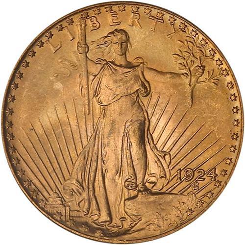 Untoned with blazing cartwheel luster that atones for a few microscopic marks on the attractively frosted central devices. Struck with systematic exactness throughout, as are almost all 1924 twenties in this desirable gem grade.