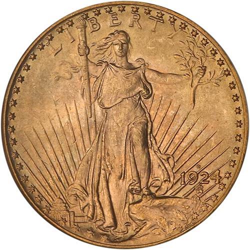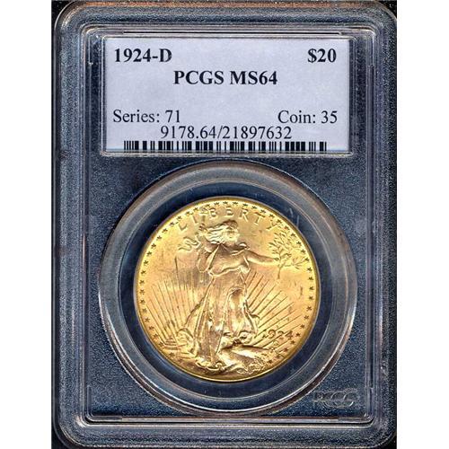 The 1924-D is the first of the rarely seen mintmarked issues that continue through the end of the Saint-Gaudens double eagle series in 1933. The majority of Mint state survivors in today's market originated in European hoards of the 1950s, 1960s, and 1970s. Bowers, in describing the 1924-D in his book on double eagles, has this to say, "Most were probably retained in the United States and melted in the mid-1930s. However, at least a couple thousand were exported. Today, the 1924-D is quite scarce. However, offerings are frequent, due to a combination of more pieces being available and the curious situation, prevalent throughout numismatics, of buyers taking home a piece from an auction, then putting it back on the market soon thereafter. Sometimes a rare double eagle will do quite a bit of traveling around until it finds a lasting home." Of course, when Bowers describes the offerings as "frequent" he fails to mention that the frequency is for MS60 to MS63 level coins, with higher grades much more difficult to obtain.