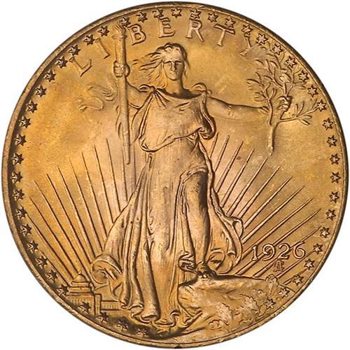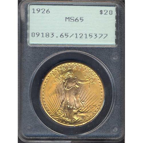 Early PCGS holder. Pleasant, almost cheery gold satin frost display lots of fresh gold vibrancy. About as fully struck as these 1926-dates are normally found, with just terrific detail in Liberty's gown folds as well as good depth of strike on the eagle, its wings, neck feathers, and body detail.
