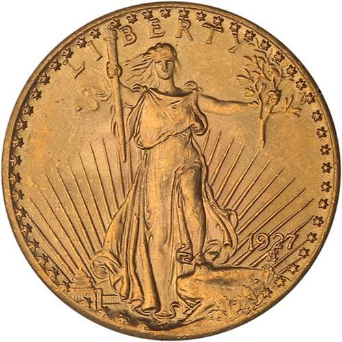 Both sides display an exceptional frosty sheen and bright, choice satiny brilliance, being predominately yellow-gold with a touch of reddish color.