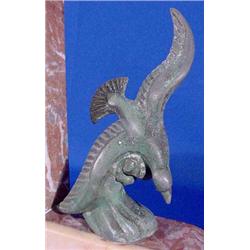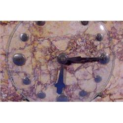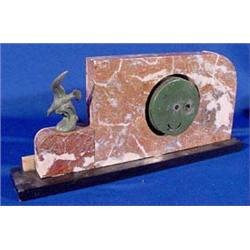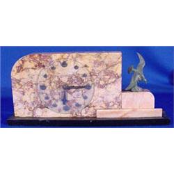 Three (3) piece Art Deco marble German mantle clock. Stylized marble mantle clock with chrome and glass front. Clock has metal patinated bird sculpture. Minor chipping. Small ball missing off face to hold glass down. Very heavy. Ca. 1920. 18"w x 3"d x 8.5"h. Est. $200 - $300.