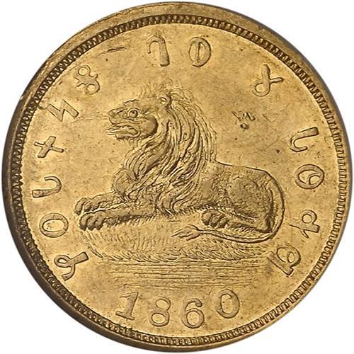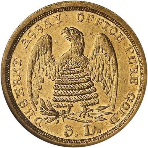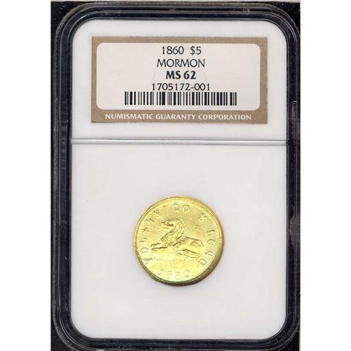The final gold coinage from the Deseret Assay Office consisted of five-dollar gold pieces dated 1860. These were made between February 28, 1861 and March 9, 1861 from 1860-dated dies. The gold for this issue came from mines in Colorado. Consistent with earlier Mormon gold, the 1860 coinage was in great demand in and around the Salt Lake region, but it failed in circulation among the those outside the Mormon religion. Most examples that worked their way East or West from Utah were therefore melted. This issue is seldom offered in any grade in even the big "name" collections. Mint State coins of the caliber offered here are especially rare and desirable.