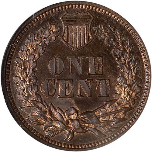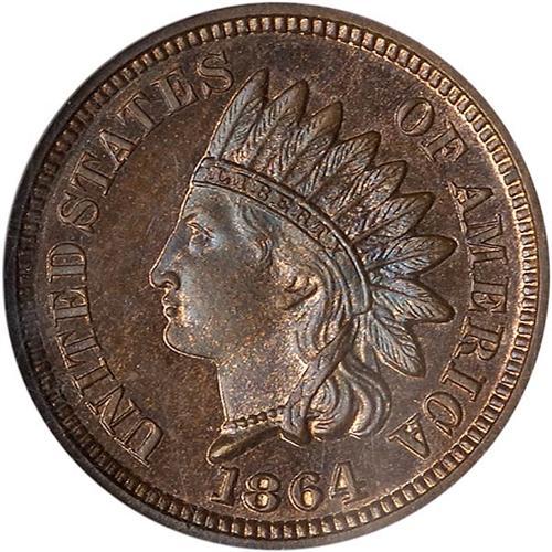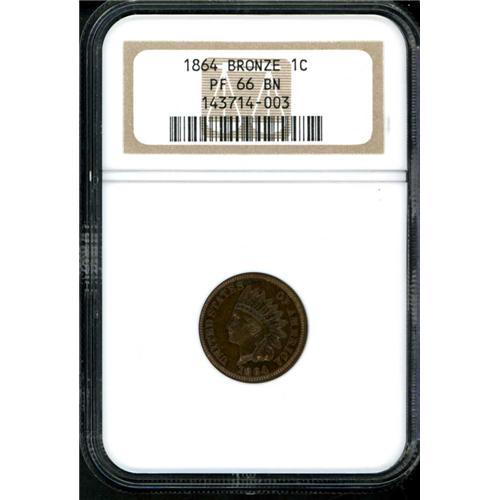 A second delightful Gem brown Proof of this first year of the new bronze, 48-grain Indian cents. This piece, like the other, has simply outstanding color, surfaces, and strike detail on both sides, and fully earns its 66 grade. Oddly enough, Proofs of this type are usually of exquisite sharpness of strike. The new bronze cent was coined under authority of the Act of April 22, 1864, which set the alloy and made the coins legal tender up to a maximum of ten cents. Due to wartime conditions, however, hoarding of cents by the public and speculators continued through the early summer of 1864.