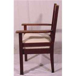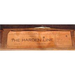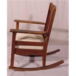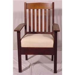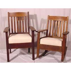 Harden Rocker and Arm Chair Set. Six slat back with peaked crest rail. Very good original finish and condition. Newly upholstered spring unit seats. 38.5"h x 25.5"w x 21.5"d. Est. $450 - $650.