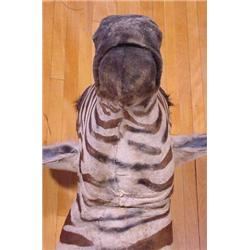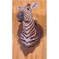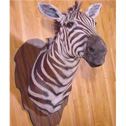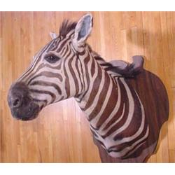 Zebra Head & Shoulder Mount; in nice condition, little dirty. Mounted on a faux walnut shaped backboard. 22"w x 38.5"l x 30"d. Est. $300 - $500.