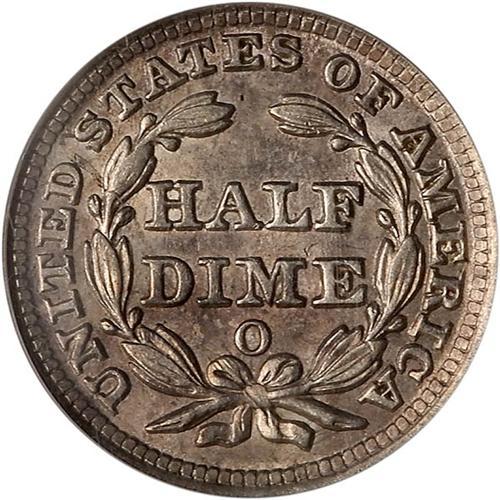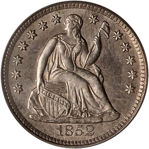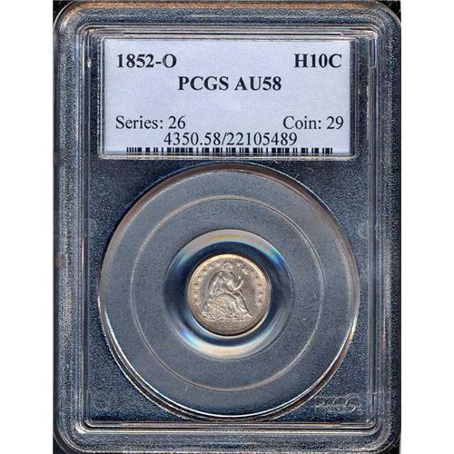 Highly lustrous and at first blush this could easily be construed as a full Mint State coin. The 1852-O, as with other New Orleans mint half dimes, is scarce to very scarce in higher grade. Many were subsequently melted after passage of the Coinage Act of 1853 reduced the silver content of the coins, necessitating withdrawal of "old tenor" coins from circulation for remelting. Mintage: 260,000, but a large percentage of this issue was melted.