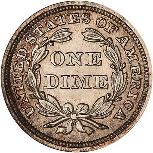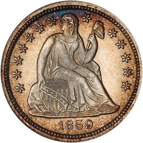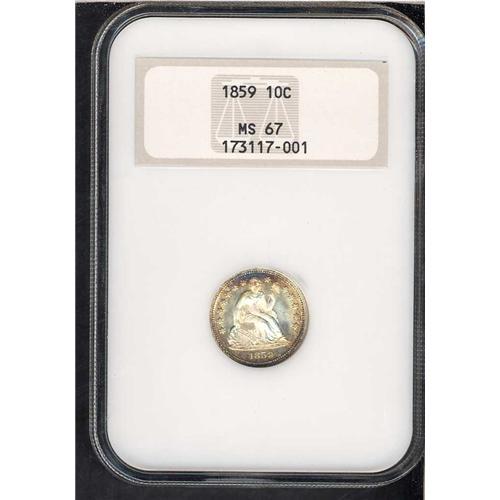 If over the years you've probably adopted a gently defensive attitude when you read about "a scintillating, superb Gem bathed in lightning white iridescence with golden peripheries". If so, then take heart, for this 1859 half dime is just that, a scintillating gem. Both its strike and surface quality appear to leave little room for improvement even though a PCGS MS68 sample is in the grading roster. This is clearly one of the nicest 1859 half dimes we have offered in years and it pleases us to no end to know that it will find a welcome new home.