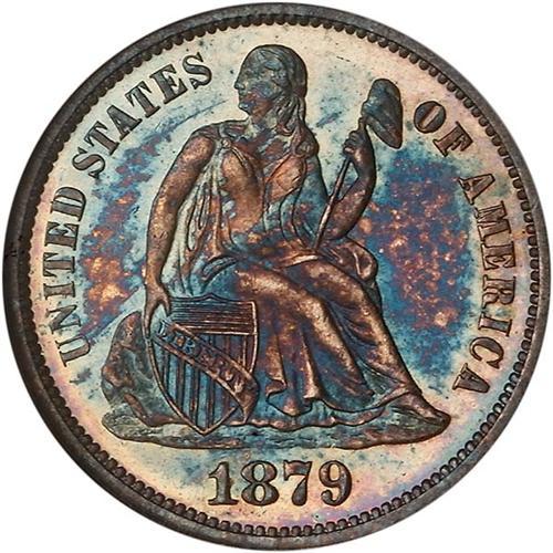 This conditionally rare offering is fully lustrous with richly frosted surfaces under very agreeable (and all original) multicolor toning. A munificent strike accompanies these, as well as freedom from the clash marks typical for this issue where insufficient die pressure occurs all too often. And that is why this is a coin to jump at before it's sale is history. Only 14,000 business strikes made of the 1879 seated Liberty dime.