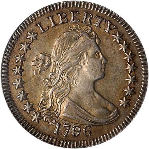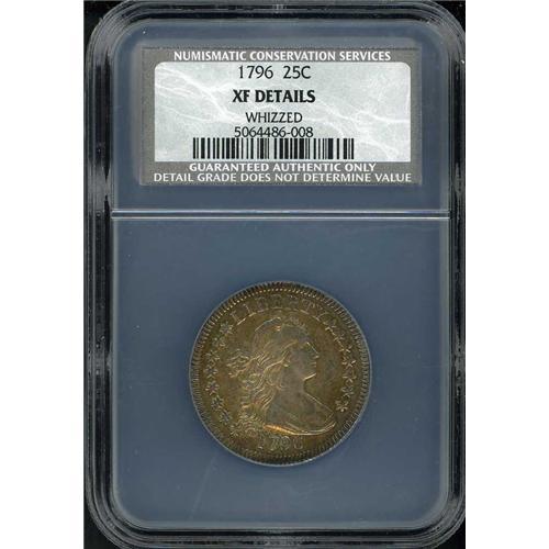Browning-2. The "High 6" variety of the issue, one of just two known die pairings for this low mintage single year type. This is the more common variety of 1796. But there is nothing about a nice high quality 1796 quarter dollar, a coin that has long been admired by collectors as a very scarce one-year Type. First, the mintage. Only 6,146 of these were made from two pairs of dies. Second, many saw extensive circulation. High grade examples, even those that were cleaned or, in this instance, "whizzed" on a wire brush machine, are still very collectible items and rich in the lore of American numismatics. A coin bathed in warm russet brown to medium gray toning.