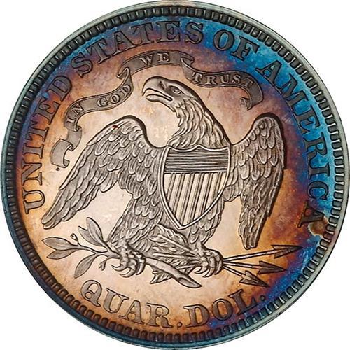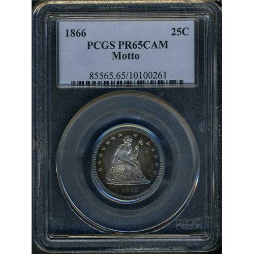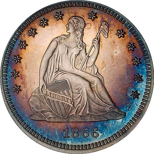 Coins dated 1866 are a favorite of numismatists. First, only 625 Proofs were sold to collectors -- a small number by anyone's reckoning. Second, with the addition of the national motto, IN GOD WE TRUST, a new design was initiated. Third, American society was striving to regain its bearings after the twin disasters of Civil War and Presidential assassination. And last, the date just looks inspiring: 1-8-6-6. Combine these with the aforementioned spectacular quality and you have a coin your friends and family will be hounding you to show them!