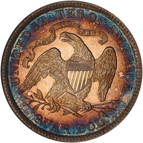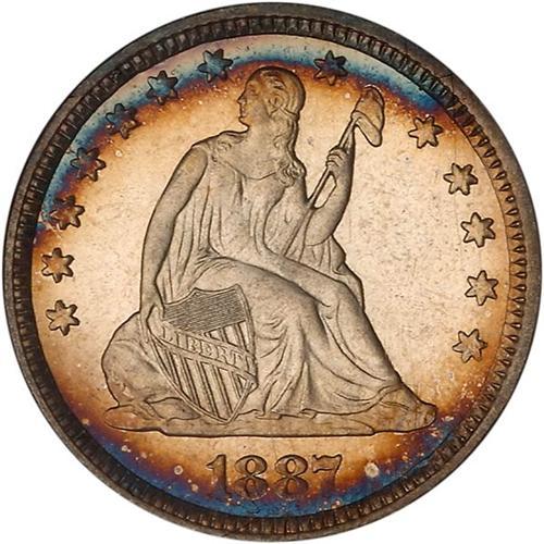 A frosted gem with strong underlying mirrors from the carefully made Proof dies that reinforce the beauty of the frosted relief of Liberty and eagle. Only 710 Proofs were made of the 1887 date. This piece has toned around the periphery in complementary colors of warm russet brown and blue iridescence.