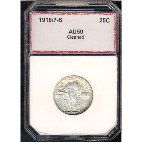 (PCI graded AU50). Although lightly cleaned at one time, leaving behind untoned surfaces, the fact remains the surfaces still retain luster on both sides, the detail inviting your inspection with a loupe, and the status as an overdate rarity locked in stone by the rigors of time and generations of avid collectors of this series. To put it in a nutshell, this is one of the celebrated rarities of the 20th century. Few overdates were struck after the mints went to more technically proficient production in the late 1890s, and all are eagerly sought by collectors. Perhaps one thousand of these 1918-D, 8 over 7 quarters exist, mainly well worn. The grading services have seen just a few over 500 in all grades. This one has the diagnostics referred to in the Breen Encyclopedia. The overdate is clear with or without a magnifying glass. The belief is that in the rush to get dies prepared, one 1918 die received a blow from a 1917 master hub, then the hub was switched to a 1918 hub, and the die was struck again. Quality control at the mint failed to notice the overdate, or let it go with a shrug of the shoulders, and the die was shipped and put into production at the San Francisco Mint. This lustrous, naturally preserved and toned example is at the high end of the "circulated" scale and deserves special mention for its beauty and desirability.