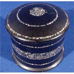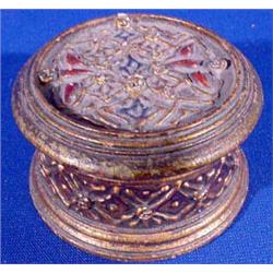 Early box lot of Four (4) Miniature boxes. The paper mache box is 3"h x 3"w. it has minor edge wear. The light gloss finish is inlaid with steel chips, Oriental, Ca. 1850. The gesso on wood box is 2"h x 3.5"w. it is decorated with gilt paint. Italian, Ca. 1890. Victorian enamel painted glass box 1.5"h x 1.75"w, Ca. 1900. The still life painted box is 2"l x 3"w. Italian, Ca. 1900. Est. $100 - $200.