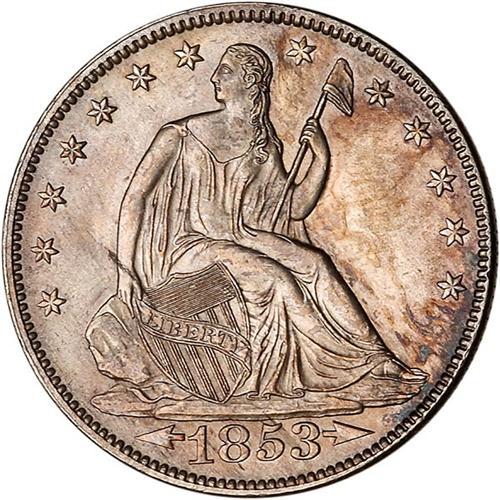 A well struck and frosty example of this important one-year design, the eagle is surrounded by a "glory" of sunrays giving a beautiful effect to the composition. The obverse has some uneven toning on the right side, primarily medium gray in color, while the reverse has splashes of golden brown in the center.