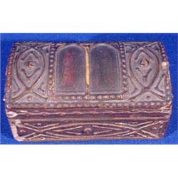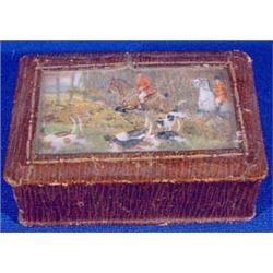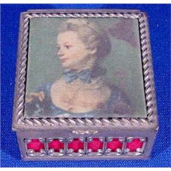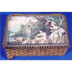 Lot of four (4) boxes. Including a silver colored box. It has a velvet interior and fabric top with a lithographed portrait. French, Ca. 1900. 2.5" x 2.5". The gold colored box has some denting and wear. Neoclassic litho landscape with figures under beveled glass. German, Ca. 1912. 3.5'l x 2.5"w. The paper box is lined with velvet. Depicts an English fox hunt print under glass. Paper has a grained finish. English, Ca. 1900. 3"l x 2"w. The wooden stamp box is paint decorated gesso. Italian, Ca. 1900. Est. $100 - $200.