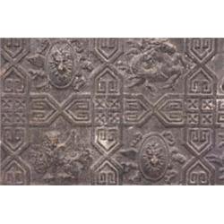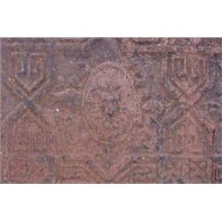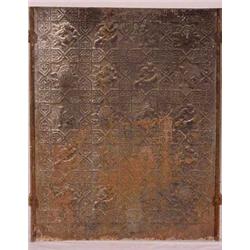 3-Piece Cast Iron Fire Back, 19th C.; Cast with repeating design of cherubs, griffins, and lion masks, within a Celtic type border. In very good condition with surface rust. 31.75"t x 25.75"w center, back 31.75"t x 15"w. Est. $200 - $400.