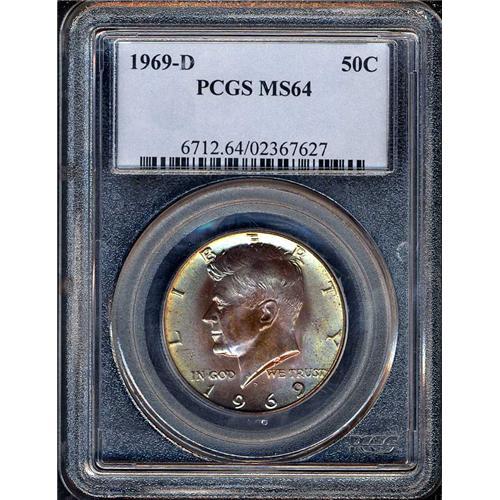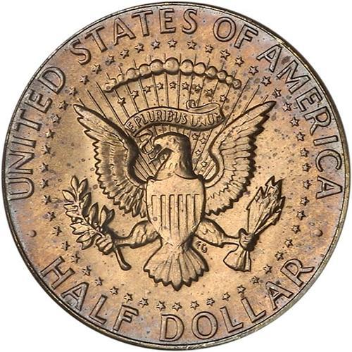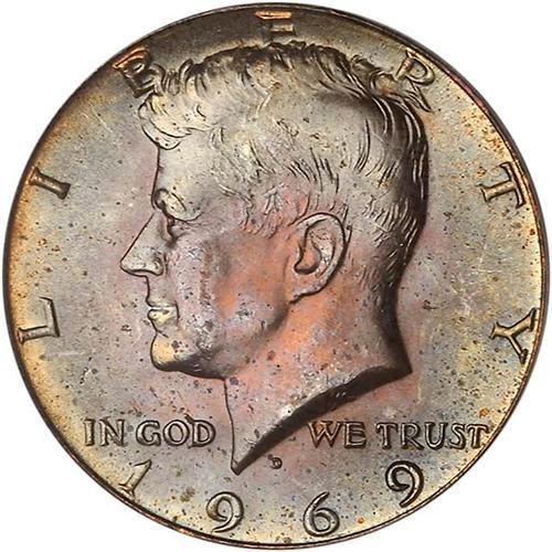 Lovely pastel to iridescent hues on this Kennedy half dollar issue, one of the short-lived 40% clad strikes made only from 1965 to 1970.