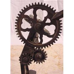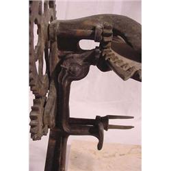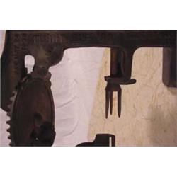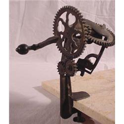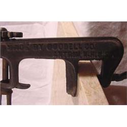 "Goodelle" Cast Iron Apple Peeler, Ca. 1900; in working condition. Cast iron table mounted peeler is inscribed "Pat. May 24, 1898 Turntable, 98 Made by Goodelle Co. Antrim. N.H. U.S.A.". This device designed with apple core ejector. Very nice condition. 13.25"l x 7.5"w. Est. $200 - $300.