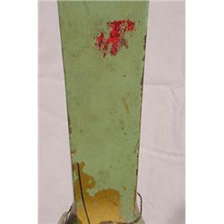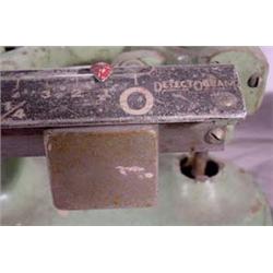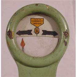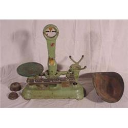 "Jacobs Bros." Commercial Store Scale; Made of cast iron in enamel green finish. Metal plate inscribed "Dect O Gram New York N.Y." includes two weights and tin pan. Finish original and worn, some chipping to enameling, losses to decoration; 19" t x 25" w x 14.5" d. Est. $100 - $200.