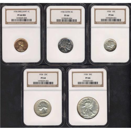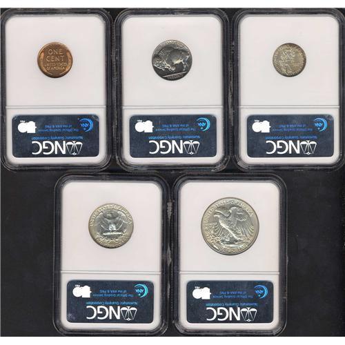 Includes: Lincoln Cent, Brilliant NGC PF64 RD; Buffalo Nickel, Satin NGC PF66; Mercury Dime, NGC PF66; Washington Quarter Dollar, NGC PF64; and Walking Liberty Half Dollar, NGC PF66. The consistent high quality of this set is noteworthy; bidders had better anticipate strong competition for it. Lot of 5 coins.