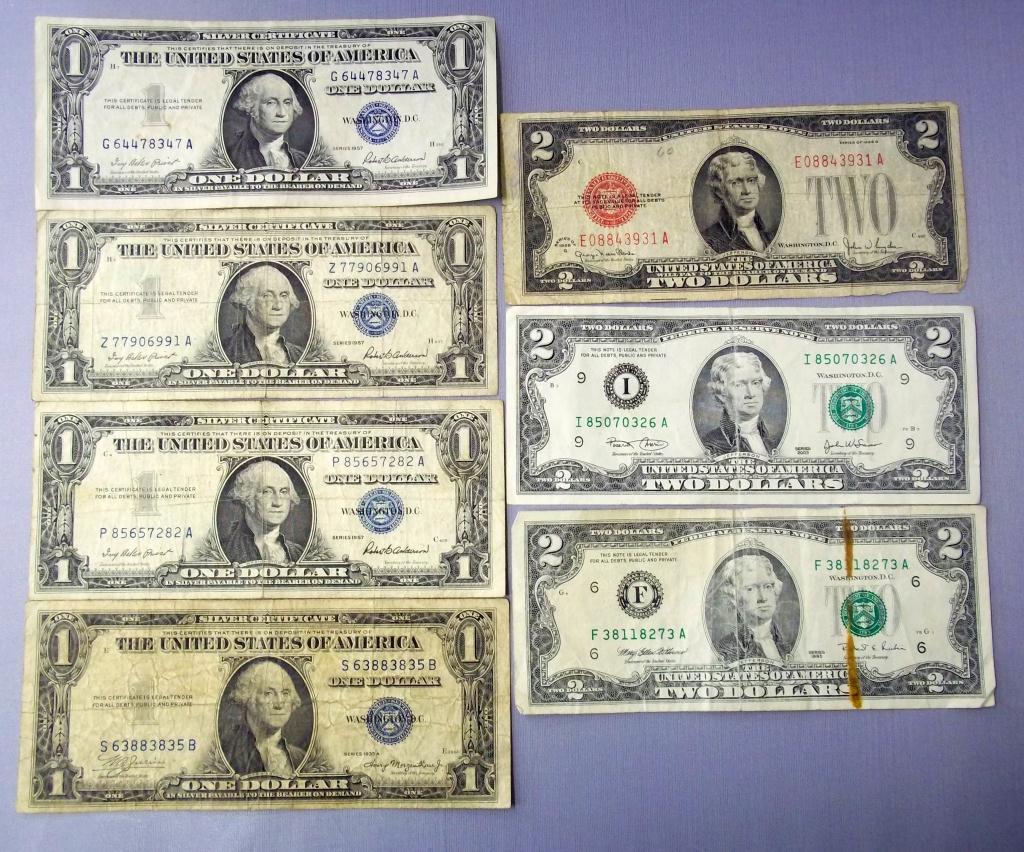 (1) 1935A $1 Blue Seal;(3)1957 $1 Blue Seal; 1928G $2 Red Seal; (1) 2003 $2 Green Seal; (1) 1995 $2 Green Seal!!