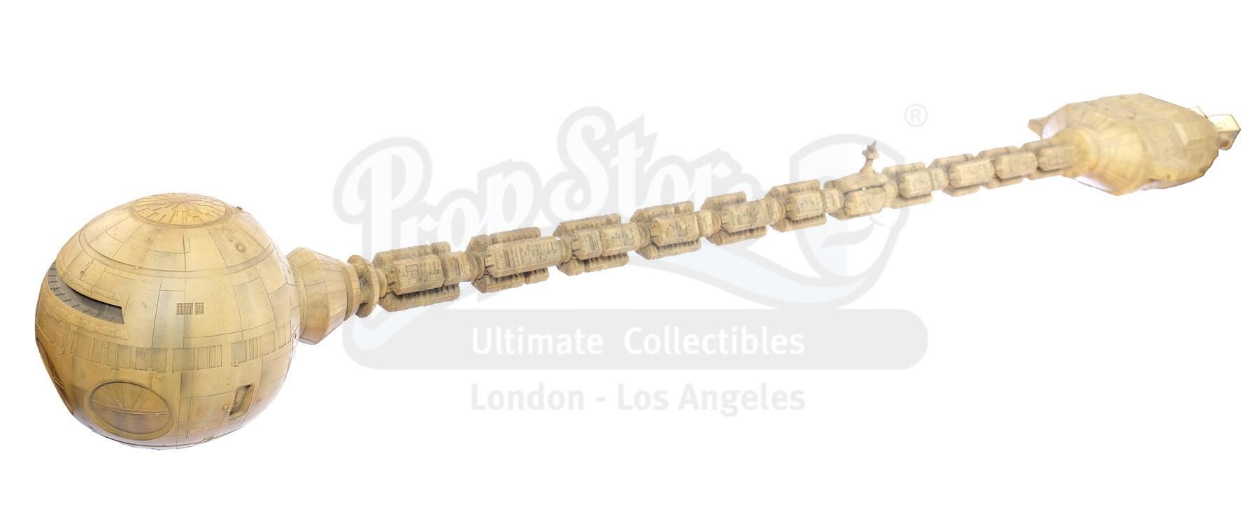 This lot will be auctioned on Tuesday, June 29th. The auction will begin at 9:00am PDT and lots are sold sequentially via live auctioneer; tune in to the live streaming broadcast on auction day to follow the pace. Note other lots in the auction may close on June 30th or July 1st. A studio-quality Discovery One model miniature replica based on Peter Hyams' sci-fi sequel film 2010: The Year We Make Contact. After its mission failed in 2001: A Space Odyssey, Dr. Heywood Floyd (Roy Scheider) was sent to investigate the Discovery One and discovered that its gray exterior had turned yellow in Jupiter's orbit. This resin model was constructed and painted goldenrod and caramel with intentional weathering and intricate molded details throughout by modelmaker Don Pennington based on designs from the original production miniature. It is in good overall condition with some wear from handling and age, including a few small scuffs and a missing thruster bell. Dimensions: 116" x 17" x 20" (294.75 cm x 43.25 cm x 51 cm) Special shipping required; see notice in the Buyer's Guide. Estimate: $5,000 - 7,000