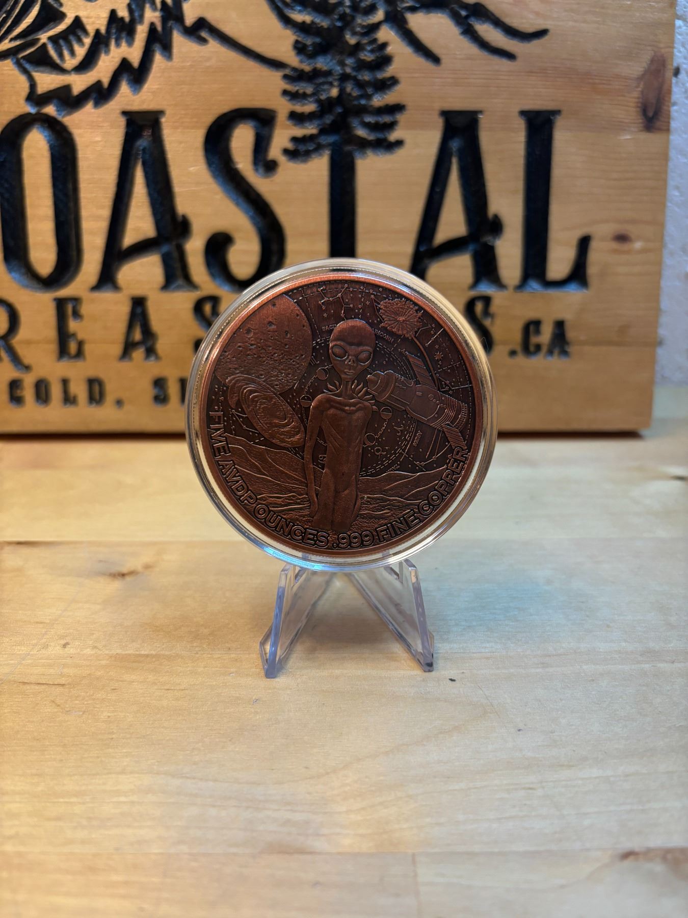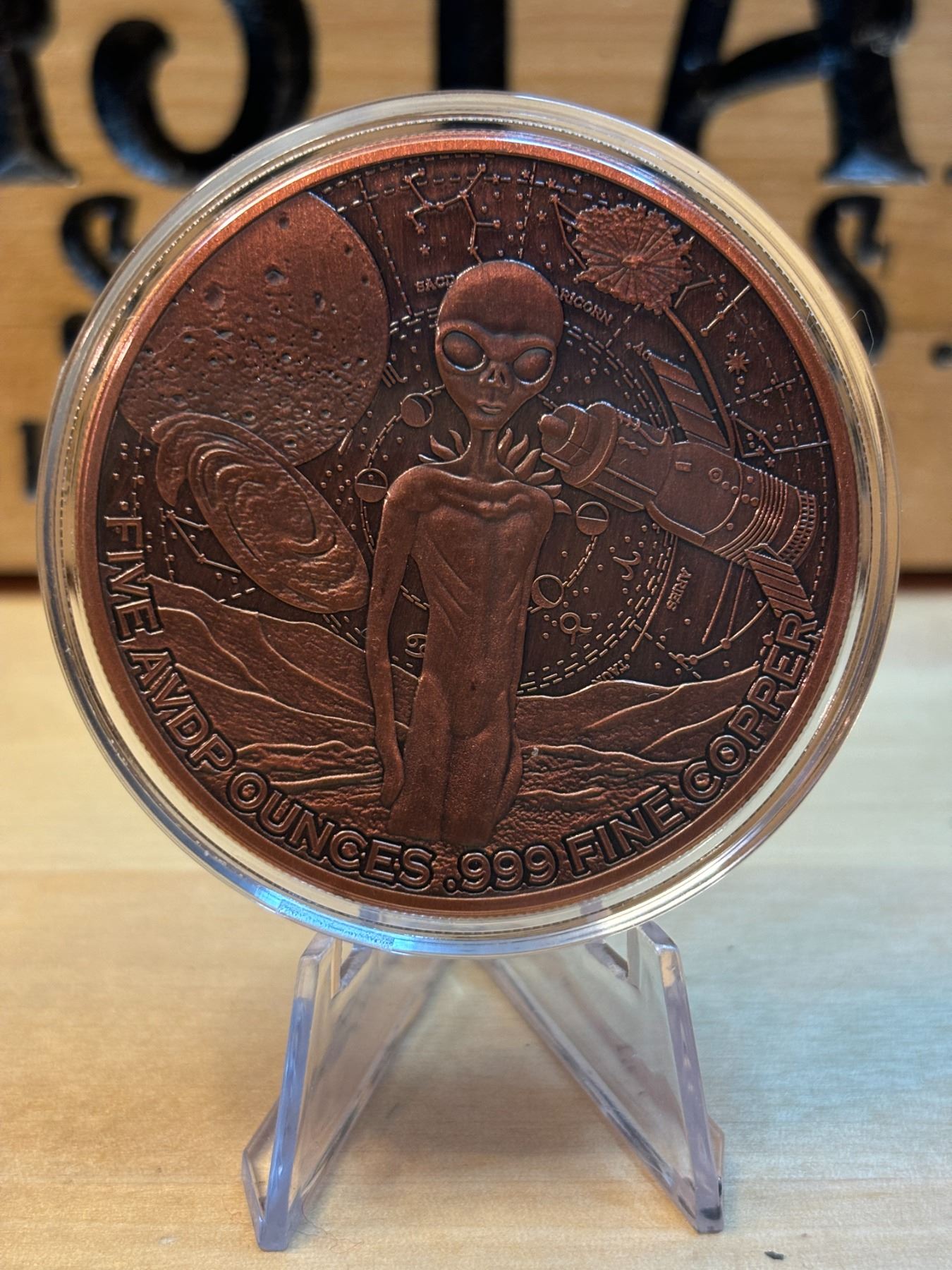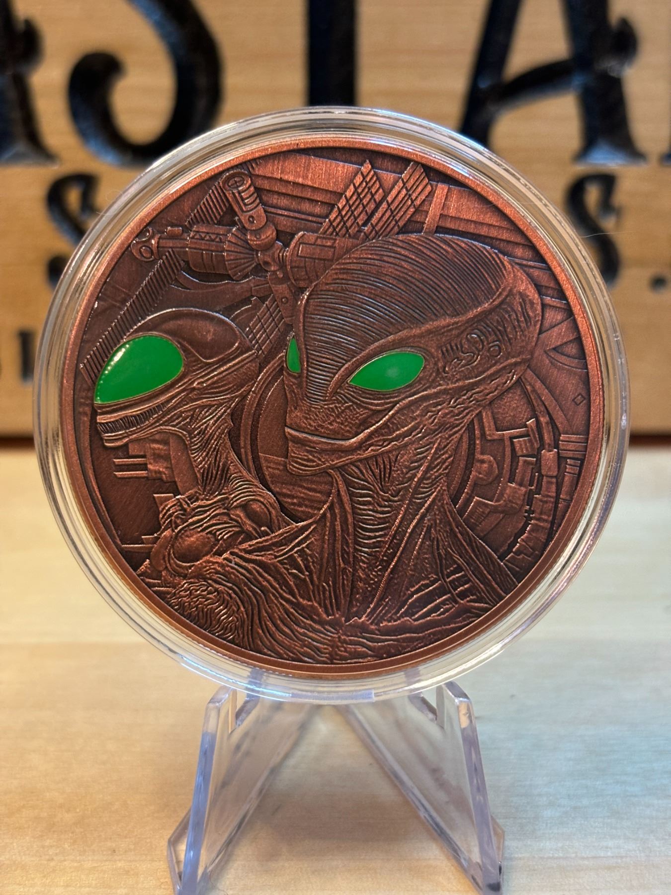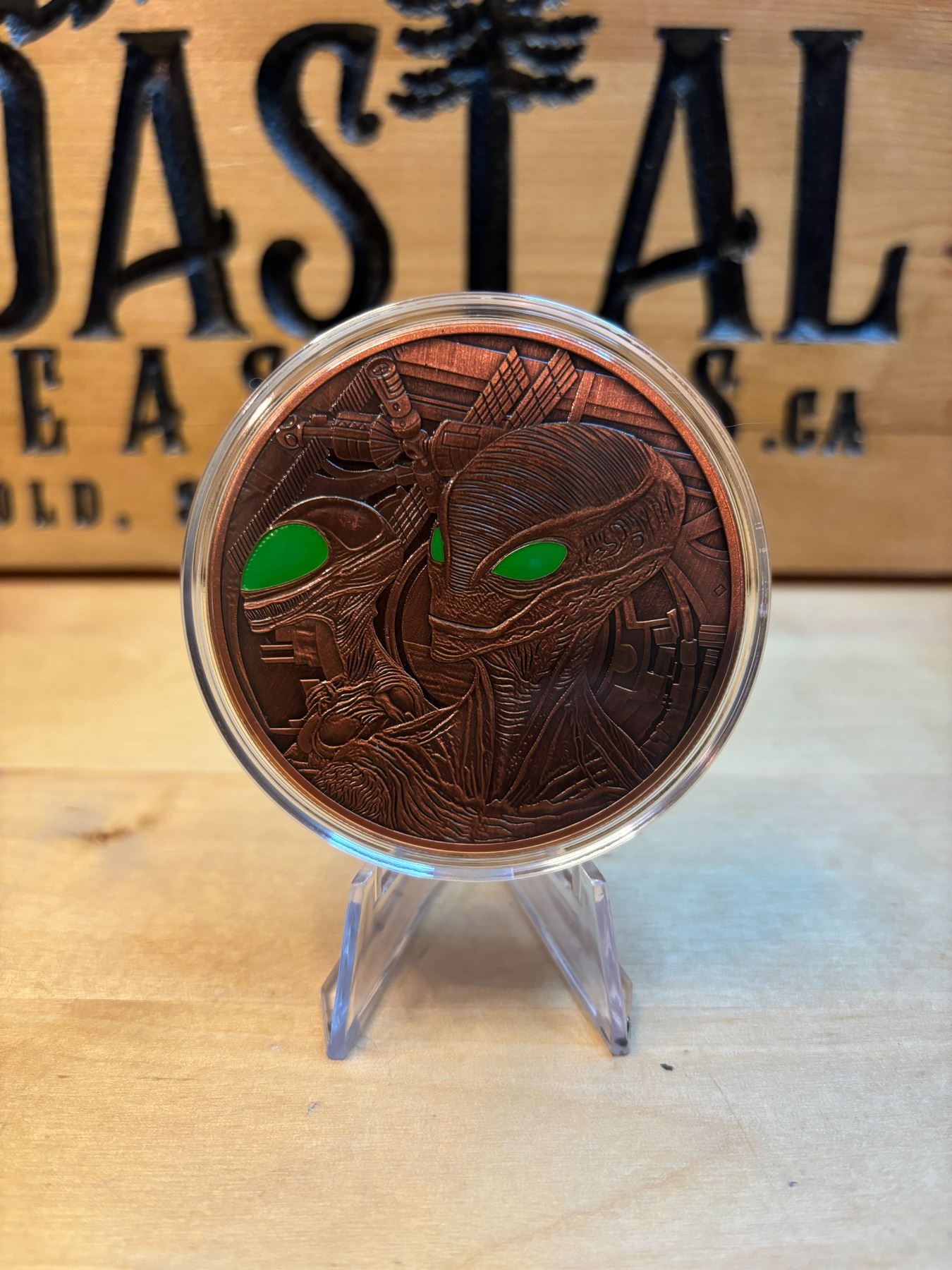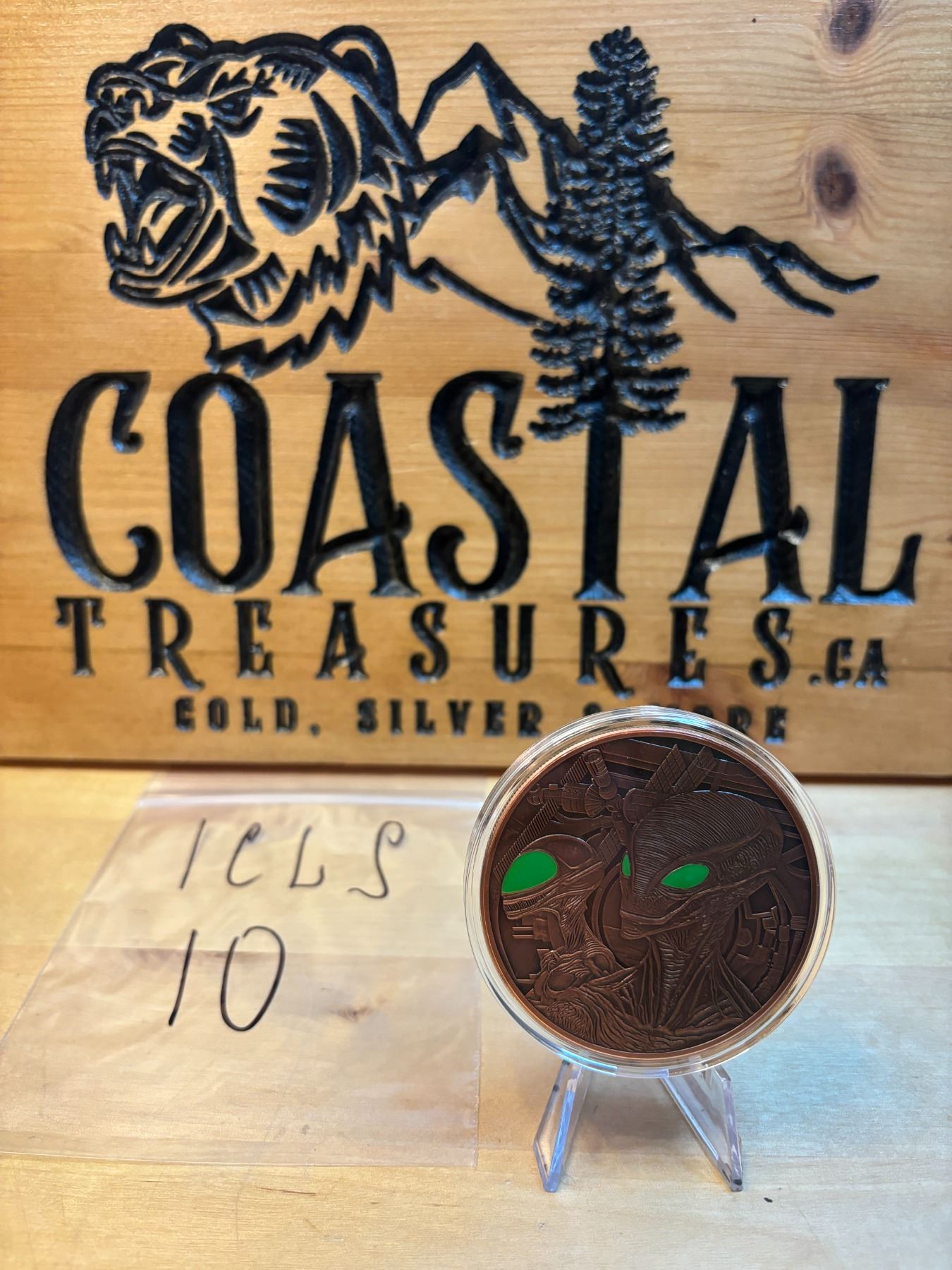 A 10 oz Colorized Alien copper round is a collectible piece of copper bullion featuring an intricate, alien-themed design, often enhanced with vibrant colours. Weighing 10 ounces, this round is more about artistic value than investment, appealing to collectors with a love for science fiction or unique designs. While not backed by a government, its value is based on the copper content, the intricacy of the design, and its appeal to niche collectors.
