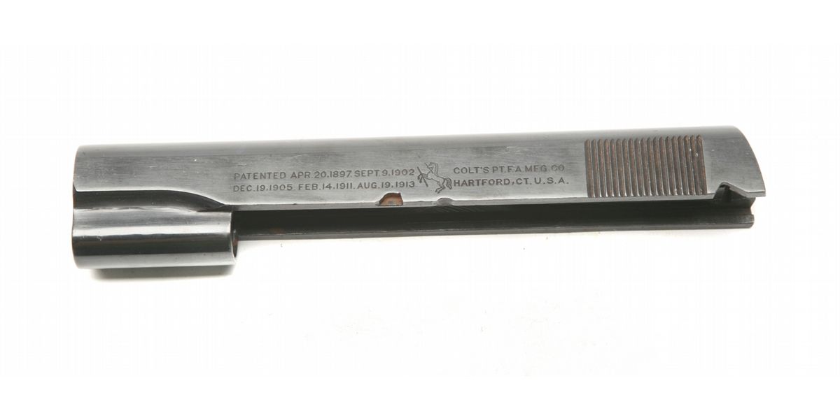 98% remaining blue - slight freckling on muzzle - missing sights - right stamped Model of 1911. US Army - left with 2-line barrel address ending patent date of 1913 - non-ffl - 25WRHKS016