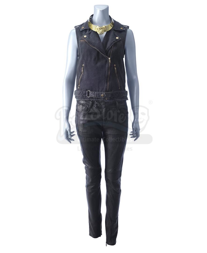 Lorelei's partial Dogs of Hell costume and Asgardian necklace from the episode 'Yes Men' (115) of Marvel's Agents of S.H.I.E.L.D. In the episode, power-mad Asgardian Lorelei wears her costume while commanding the Dogs of Hell to fight her nemesis, Lady Sif. This lot consists of a black denim vest emblazoned with a black, white, and red Dogs of Hell patch, a pair of black leather pants, and an otherworldly gold-color resin necklace. It is in excellent overall condition with minor wear from production, including deliberate weathering to the vest.