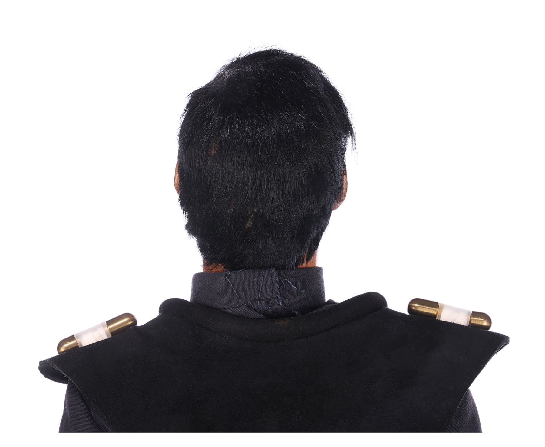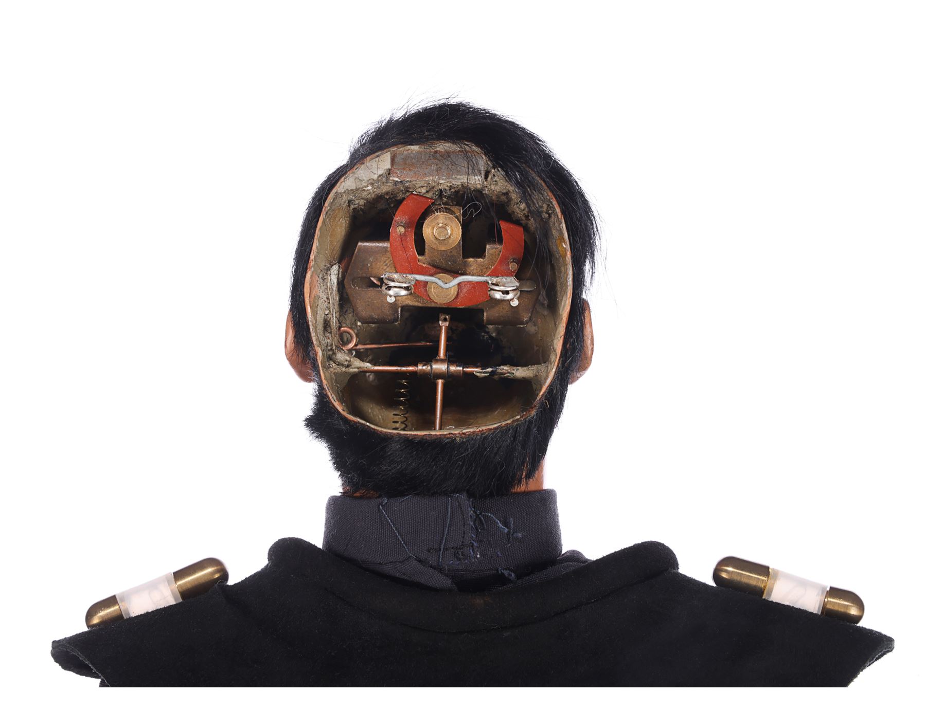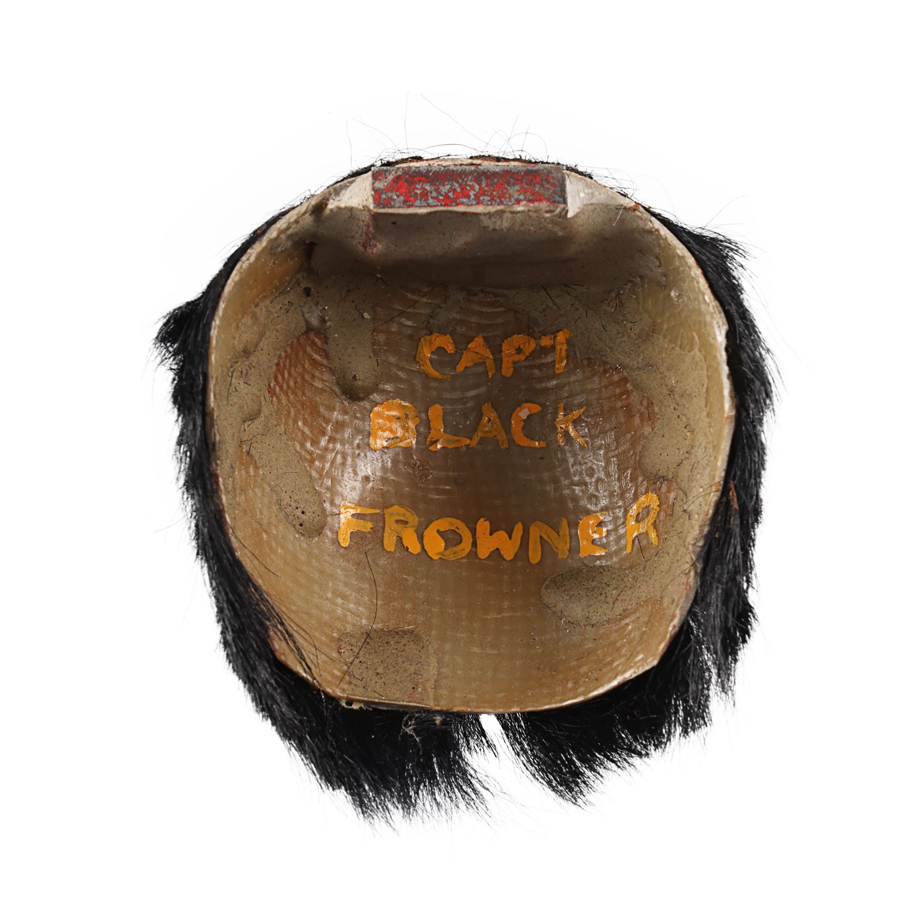 The two-part head is 11cm (4 1/4") high. It is made of fibreglass, painted and wigged with mohair, with resin eyes, each of which has a photograph of a real eye inserted. The lower lip is hinged and held shut by a spring allowing the puppet to talk. To create a more realistic effect, the Andersons' team pioneered the use of a solenoid to enable accurate mouth movements synchronised with recorded dialogue. The rear of the head is detachable to gain access to the internal mechanisms and is held in place by a magnet. Different versions of the head were made, including "normal", "smiler", "frowner" and "blinker". This head was a frowner, as indicated by the inscription of "CAPT BLACK FROWNER" on its interior.
