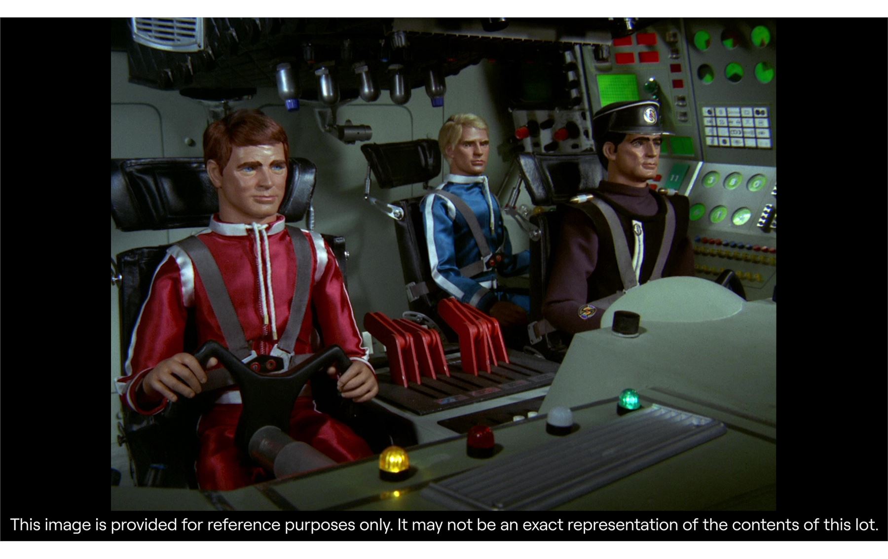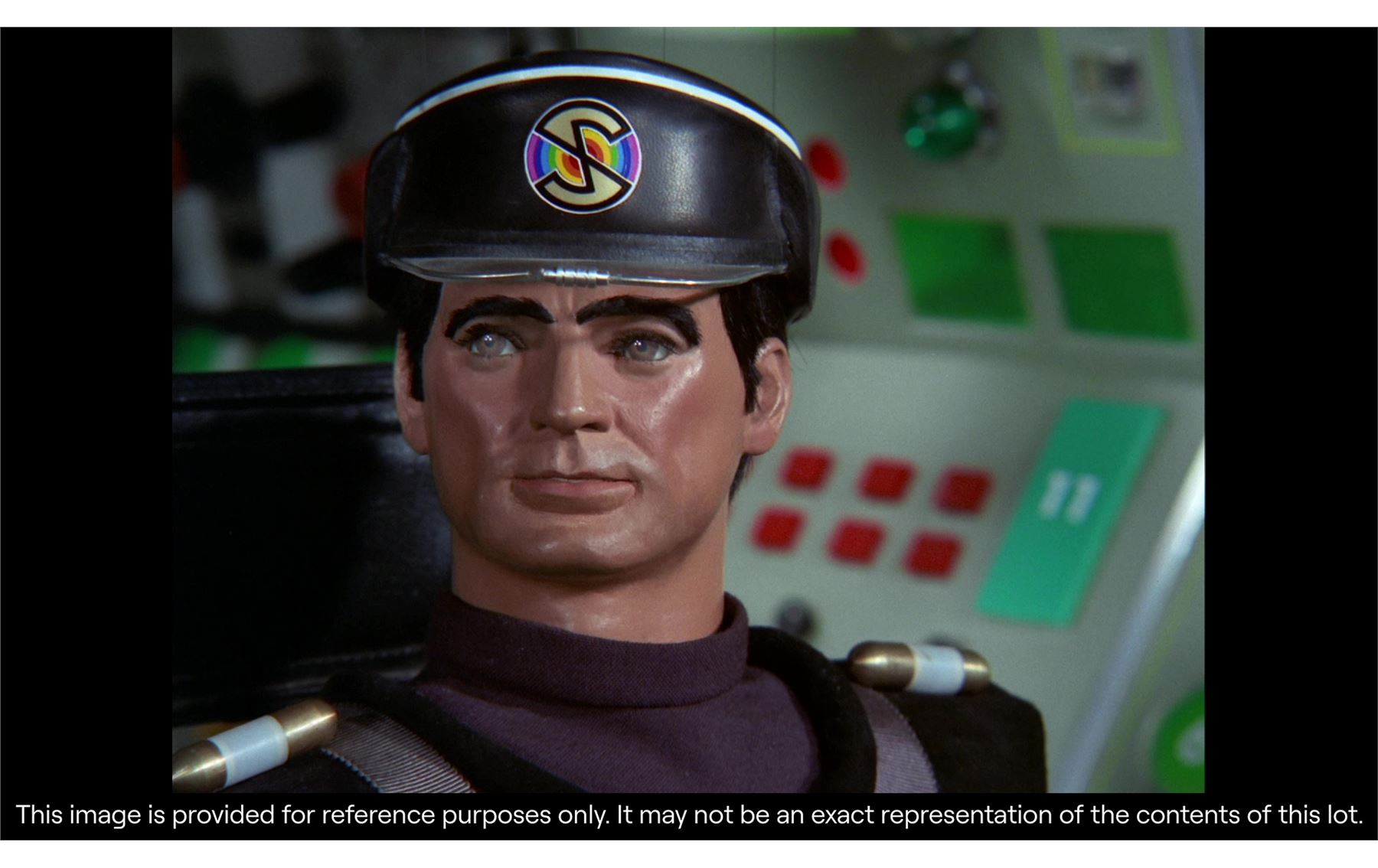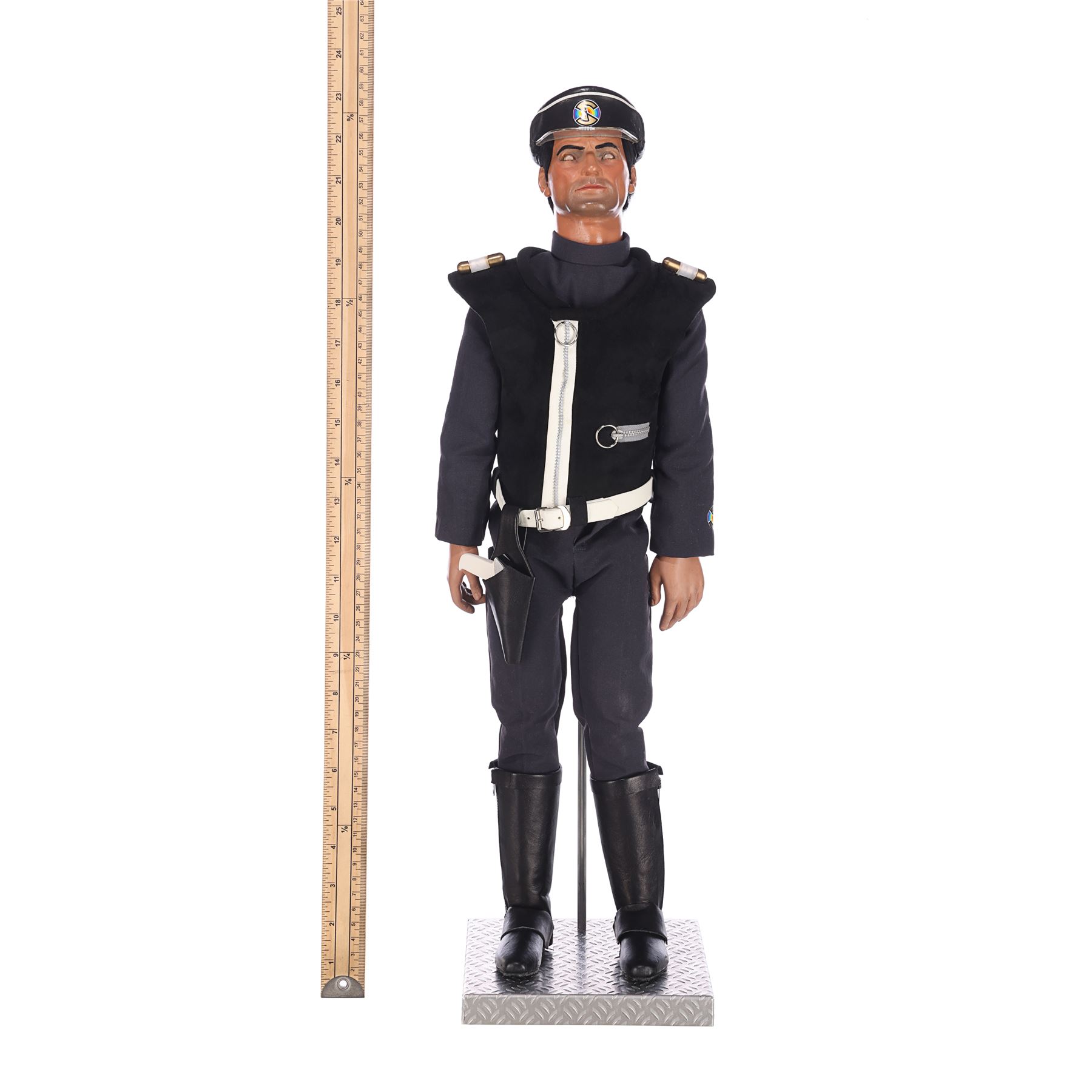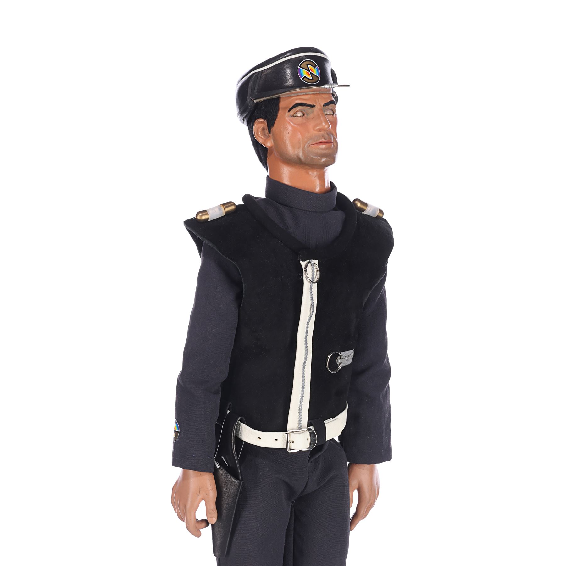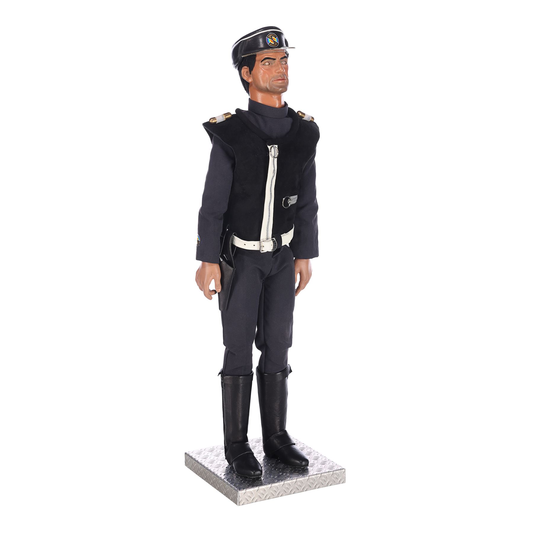 This Captain Black puppet, like most puppets from the series, was re-used for guest roles in later Supermarionation series. It appeared in Joe 90 (as General Valdes in the episode "Viva Cordova") and The Secret Service (as Kroner, in "The Deadly Whisper"), among other roles. The lot comes with a custom-made display, allowing it to stand upright, and an original booklet created for the production featuring character outlines and a synopsis. Dimensions: 23 cm x 28 cm x 65 cm (9" x 11" x 25 1/2")